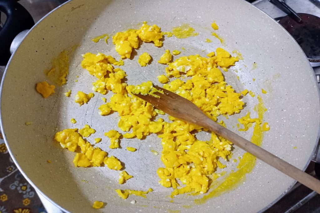 In a skillet, pour two tablespoons of seed oil and add the beaten eggs with a pinch of salt.