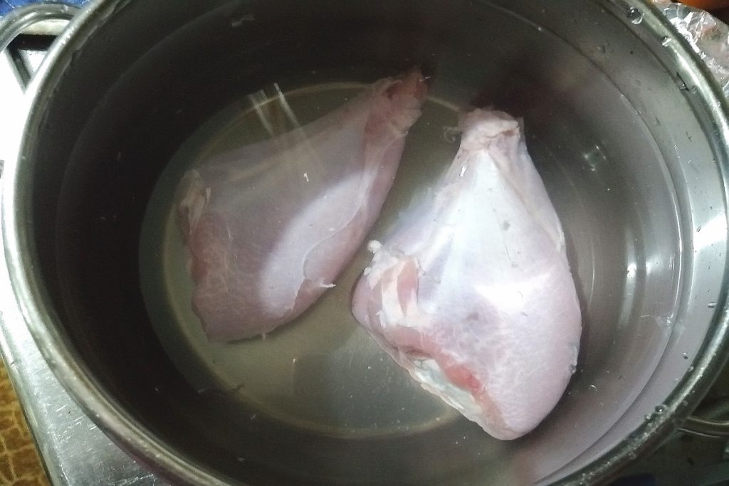 • Remove the skin from the turkey legs and place them in a large pot.