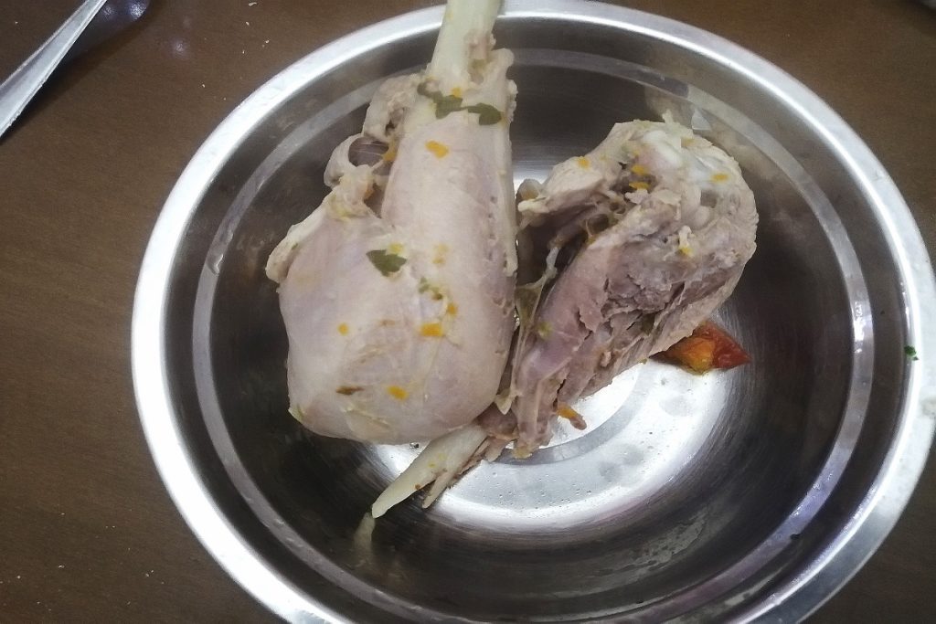 • After one hour of cooking, remove the meat, cut it into pieces, removing the bones, and place it back in the broth.