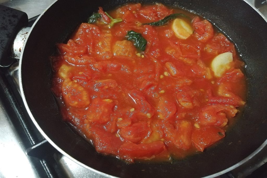 • In a small skillet pour 1 tbsp of extra virgin olive oil and 1 clove of garlic, add the tomatoes cut into small pieces.