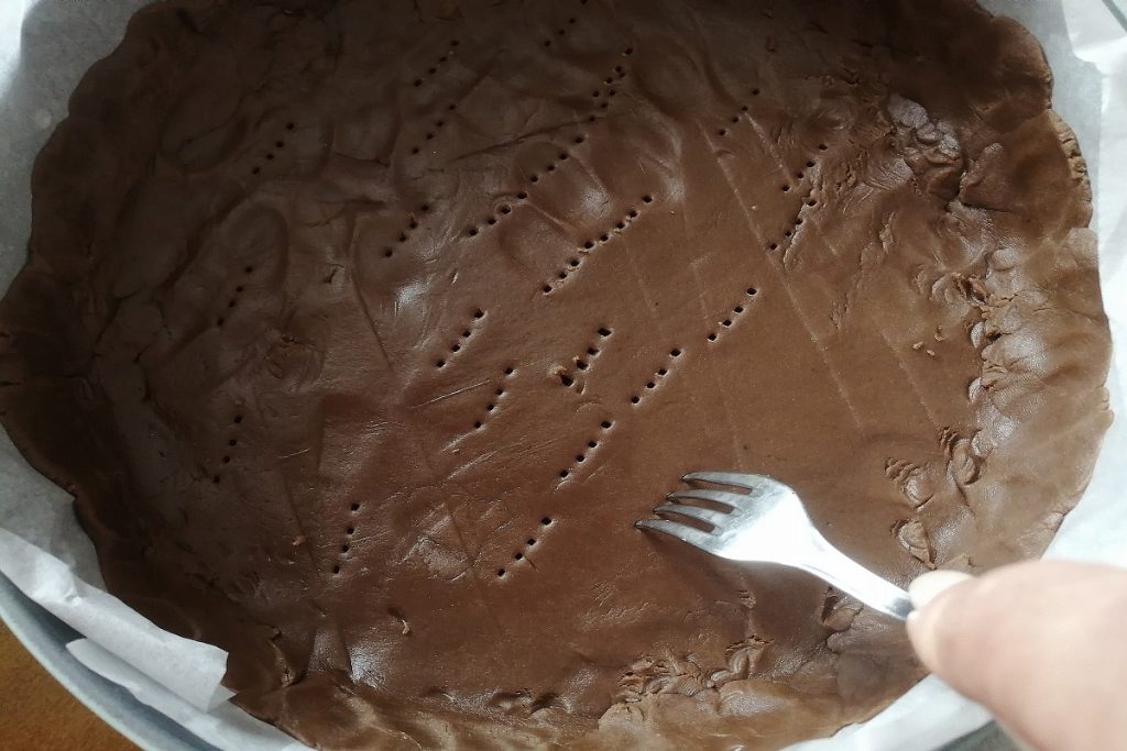Place the dough disk, creating a side border about 1-1.5 inches high, and prick the bottom with a fork.