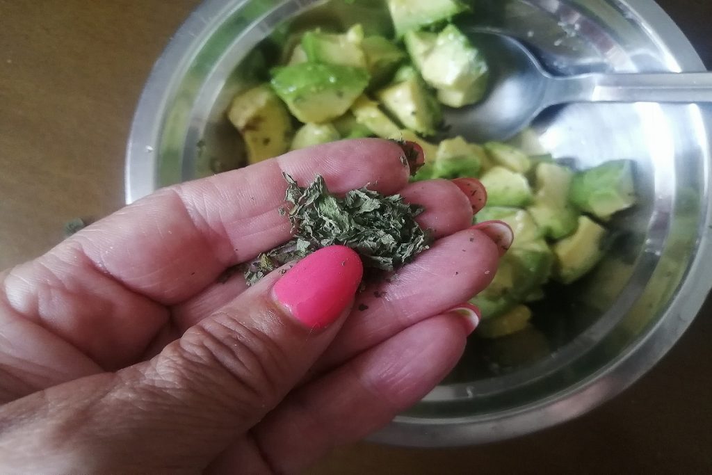 In the meantime, peel and cut the avocado into small pieces and season with the other two tablespoons of oil.