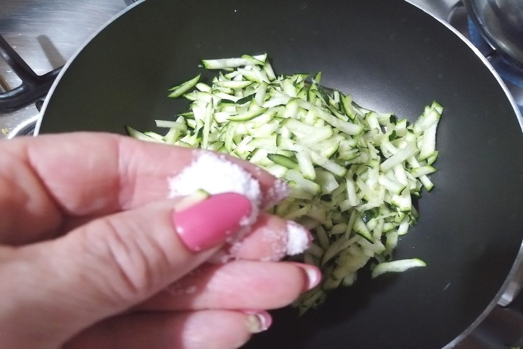 Wash the zucchini and cut it into julienne strips with a mandoline.