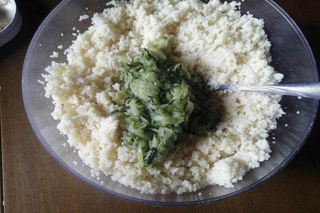 Incorporate the cooked zucchini and drained canned salmon into the couscous.