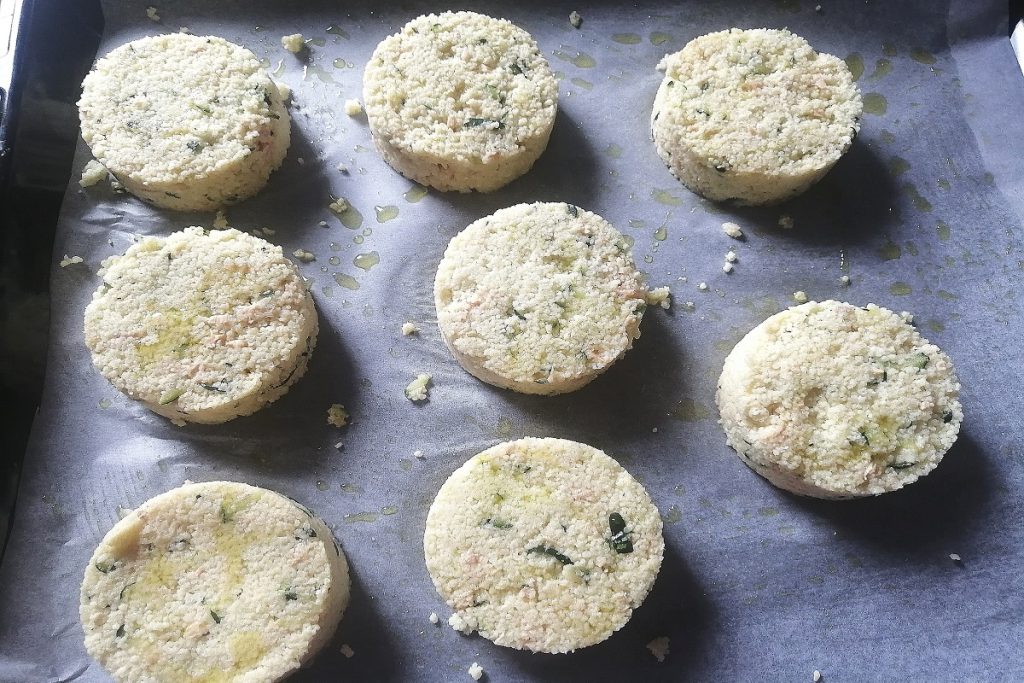 The couscous cakes with salmon and zucchini can be an appetizer idea or a single serving for dinner.
