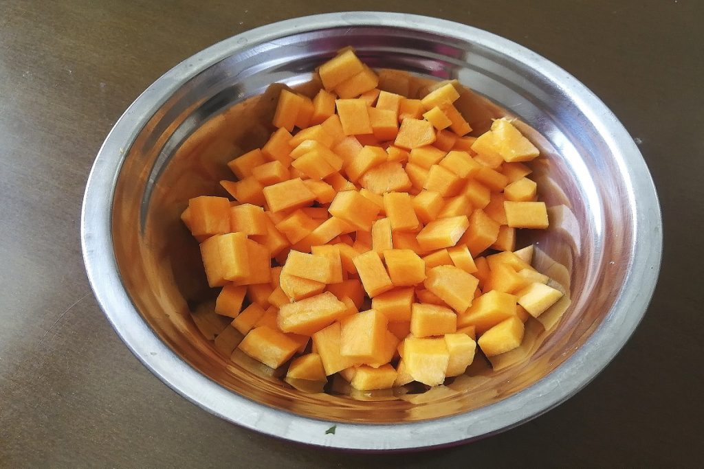 Clean the pumpkin by removing the skin and seeds, and cut it into small cubes.
