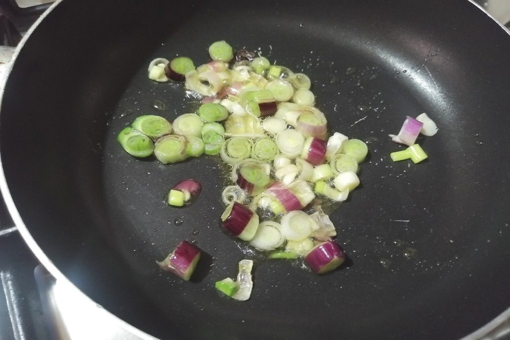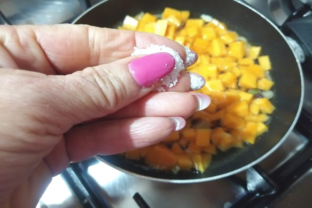 In a pan, pour the tablespoon of oil and the scallion, let it fry gently for a minute, then add the pumpkin and a glass of water.