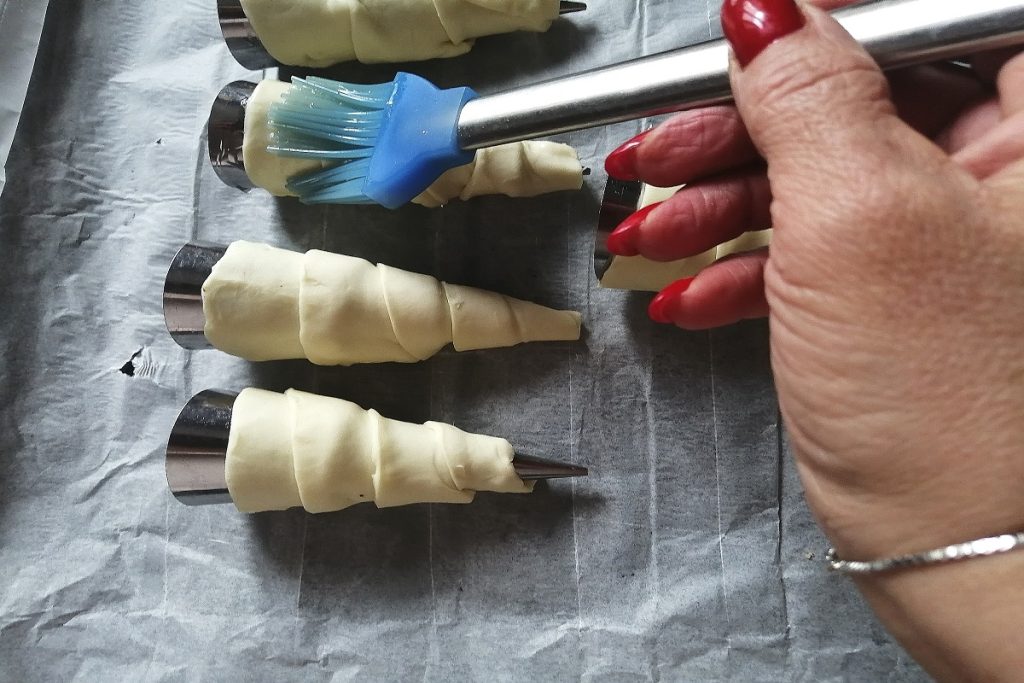 Wrap the strips around the steel mold, place the cones on a baking sheet lined with parchment paper.