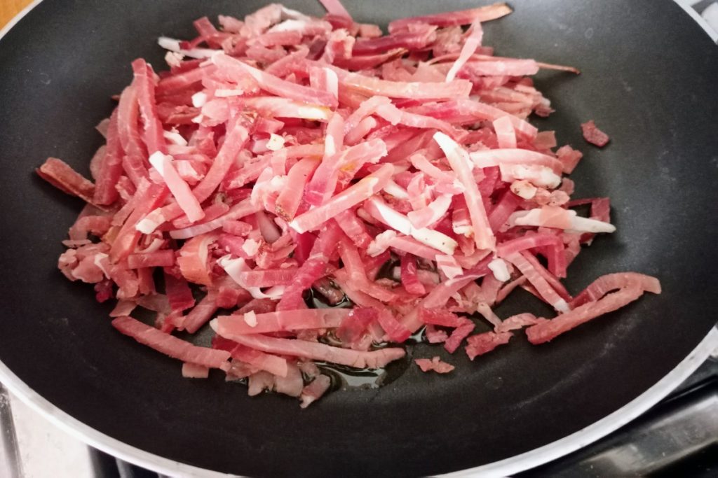 • In another pan, pour a drizzle of extra virgin olive oil and add the speck sticks, let them brown for a few minutes.