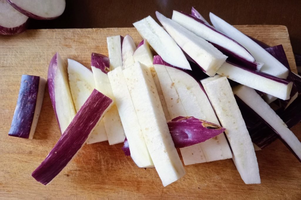 For the recipe, I used striped eggplants, I find them more tender, sweet, and flavorful, just cut them into sticks, season them with salt, and flour them before cooking.