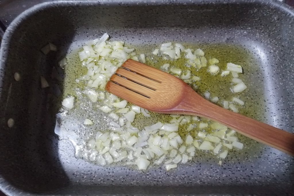 In a saucepan, pour some extra virgin olive oil, add the chopped onion, and let it soften over low heat.