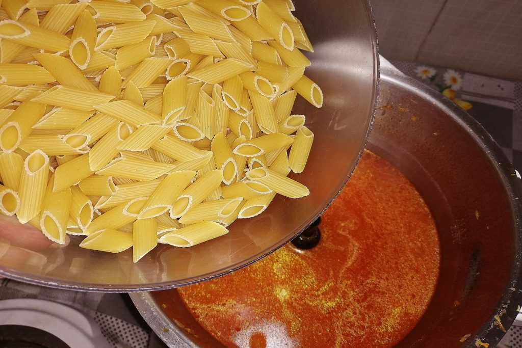 The commonly used pasta shape for this recipe is mixed pasta, but I preferred to use small ridged penne to better capture the sauce.