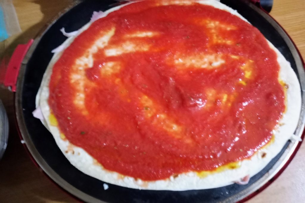• Place the piadina in the pan or on the oven tray, in my case I used the Gferrari pizza oven which I usually use for cooking pizzas.