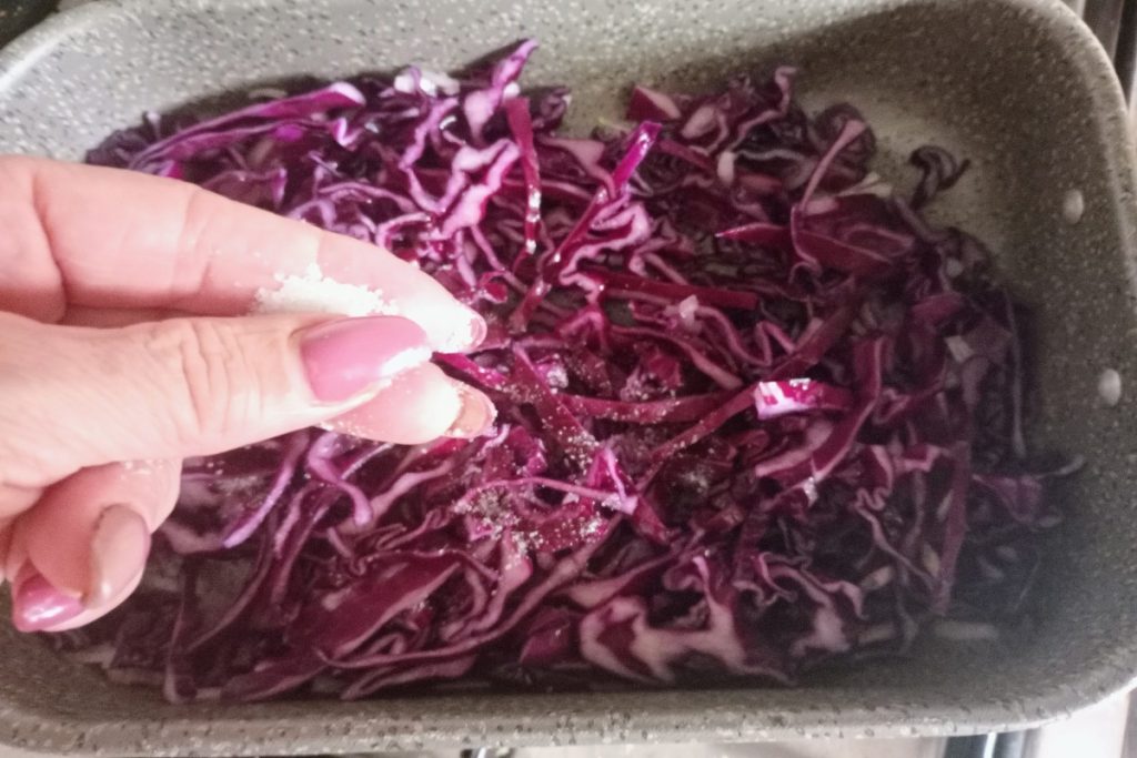 • Remove the hard white parts from the purple cabbage and slice it thinly into julienne strips.