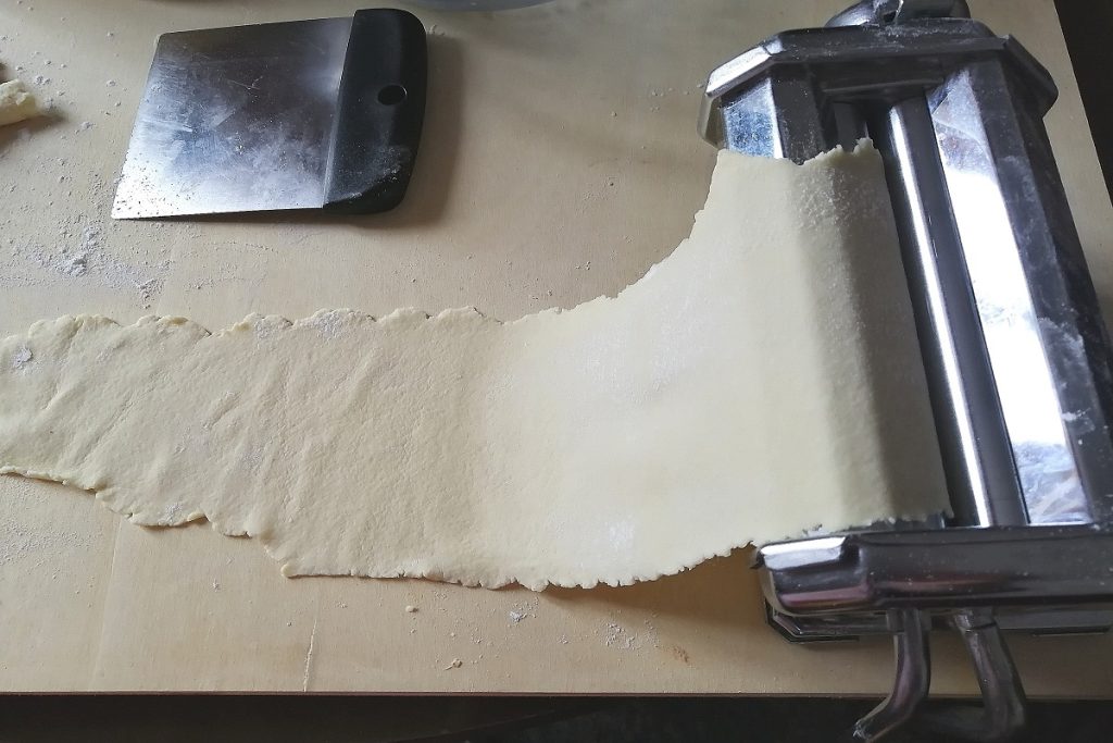 • Divide the dough into portions and start rolling it with a pasta machine on different settings until you get a thin sheet.