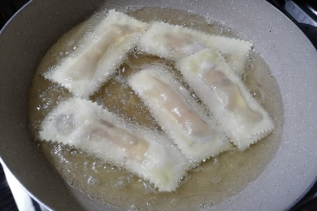 • Heat a pan with vegetable oil, and when it’s hot, immerse the chiacchiere to fry them, browning them on both sides.