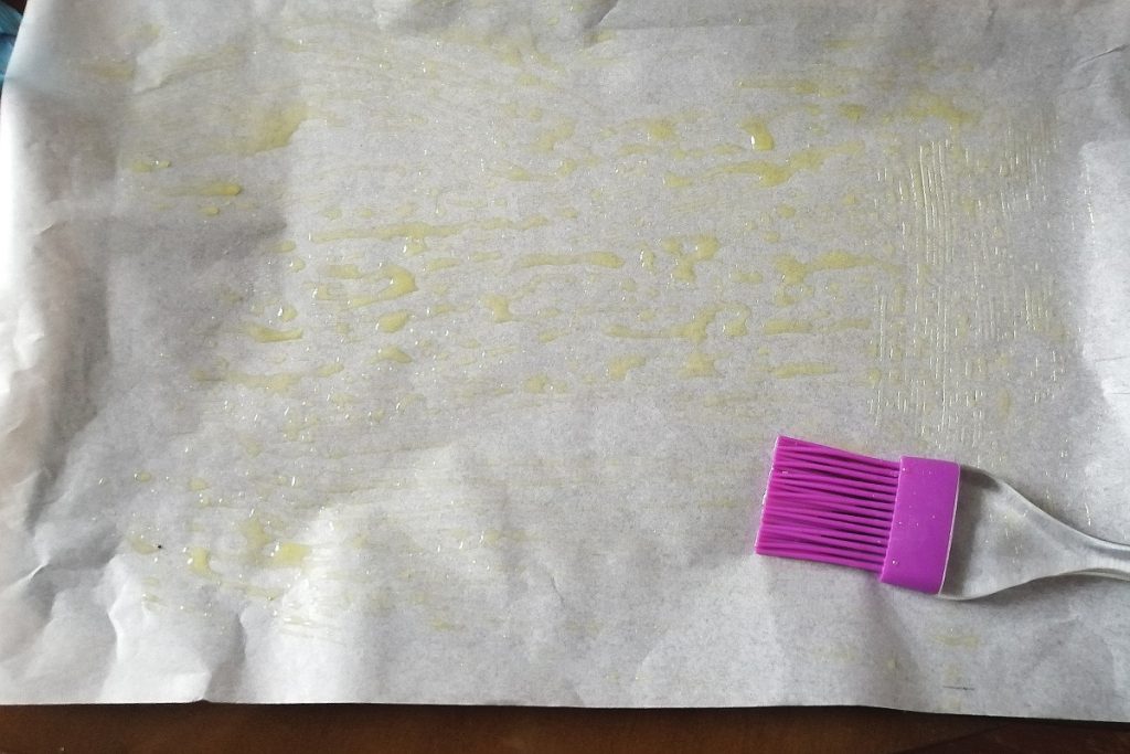 In a 9.8 in x 13.8 in baking pan (25 cm x 35 cm) place a sheet of parchment paper and brush a little extra virgin olive oil over it.