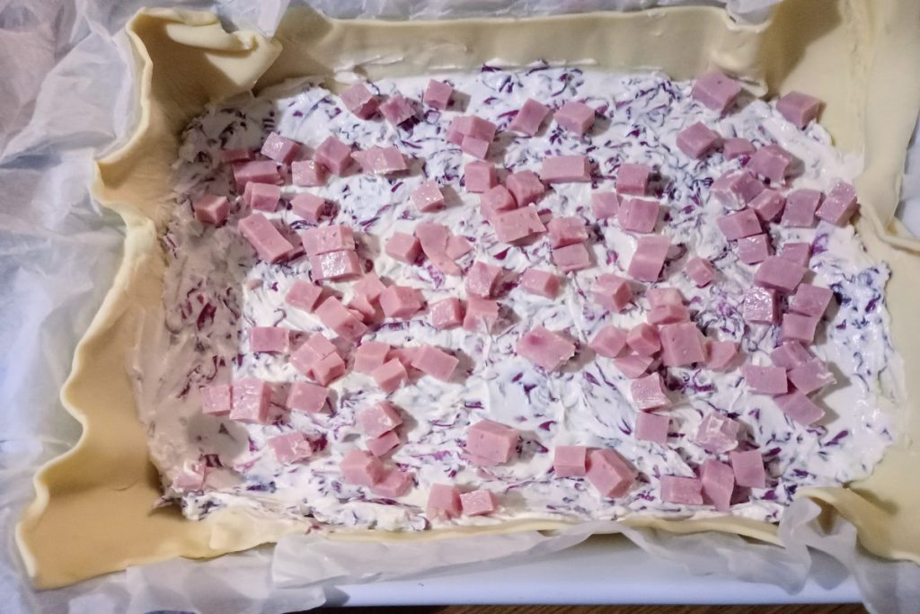 Unroll the puff pastry and place it with parchment paper in a baking dish.