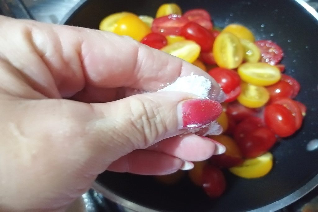 Season the cherry tomatoes with salt and oregano, stir, and cook over high heat for 5 minutes.