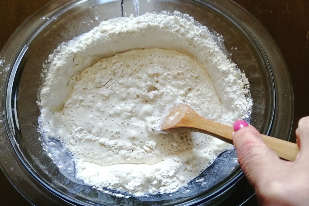 • In a bowl, pour the flour and lukewarm water with the dissolved yeast, start mixing with a wooden spatula, add the salt.