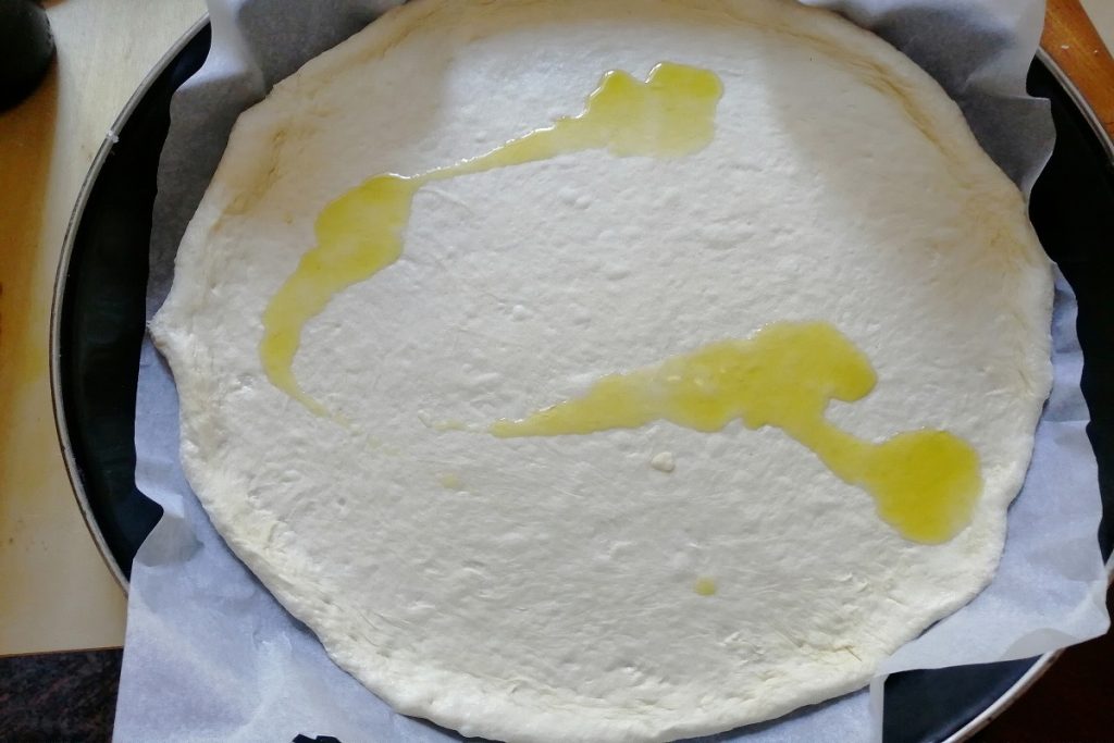 • Start rolling out the dough with a little flour underneath and on top, and brush with some extra virgin olive oil. The sheet should be a few millimeters thick.