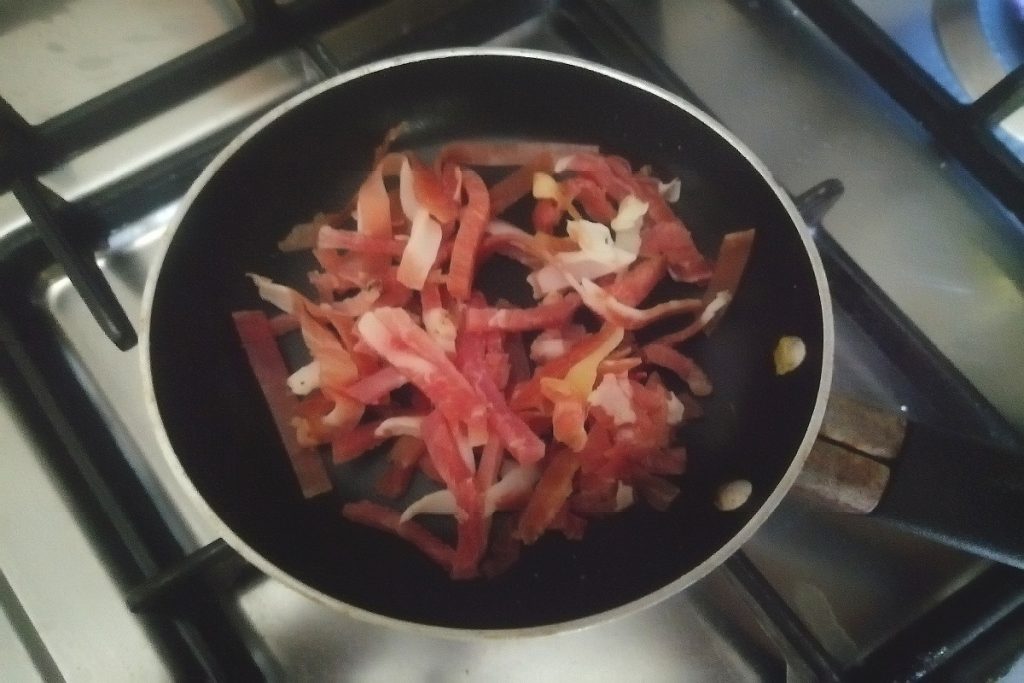 In a non-stick pan, add the speck sticks and let them brown without oil.