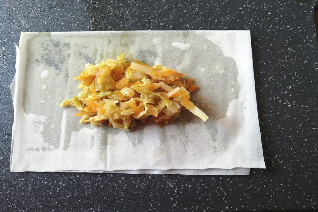 The spring rolls are made with phyllo dough and filled with a mix of vegetables, resulting in a delicious crispy bite on the outside with a soft and flavorful center.