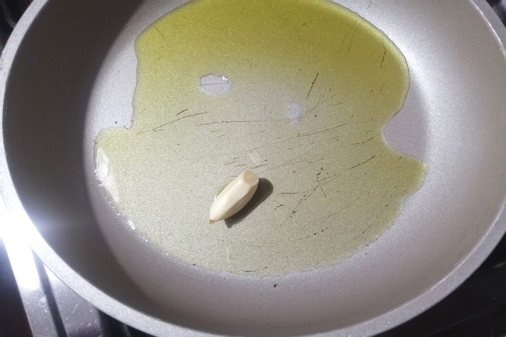 Put a pan on the heat with extra virgin olive oil and a clove of garlic, add the cherry tomatoes.