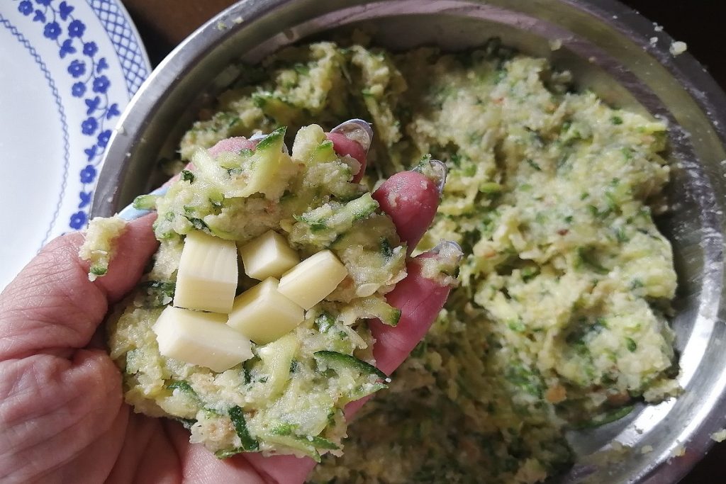 Once the potatoes are cooked, mash them, let them cool, and then mix them with the zucchini.