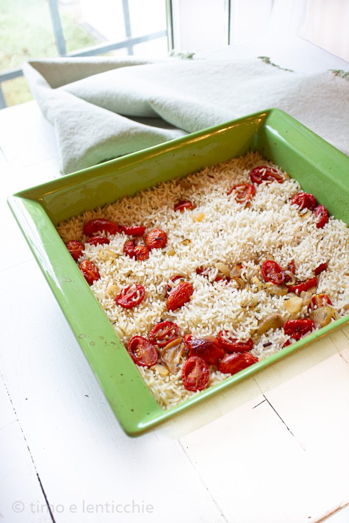 A splendid and very simple recipe, baked rice with cherry tomatoes, from Ottolenghi’s book Simple. A main course to prepare on many occasions and also with other types of vegetables. So in the summer, it’s great with cherry tomatoes, even if lightened with garlic and shallots.
