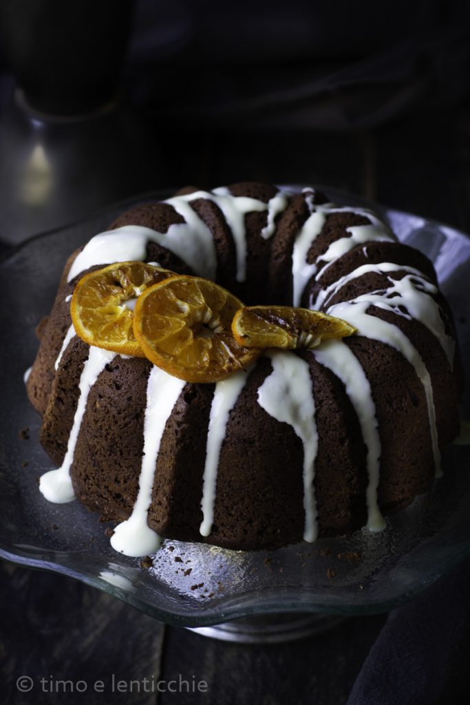 A melt-in-your-mouth cake, the chocolate and citrus bundt cake, with chopped almonds, to enjoy for example with tangerine ice cream.