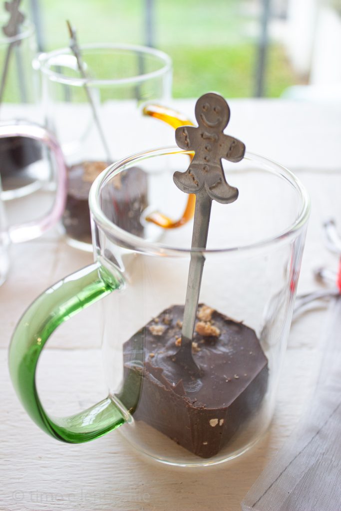 I found this idea on an American blog, where they often prepare these Hot Chocolate spoons for Christmas. Basically, chocolate cubes with a spoon inserted. Then in a cup, you pour hot milk and stir with this chocolatey spoon and drink.
