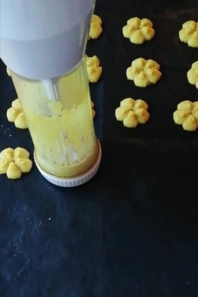 Let’s get back to our vegan shortbread cookies with a cookie press. I mainly make cookies during the Christmas season—during this time, my kitchen looks like a bakery, and the aroma fills the house.