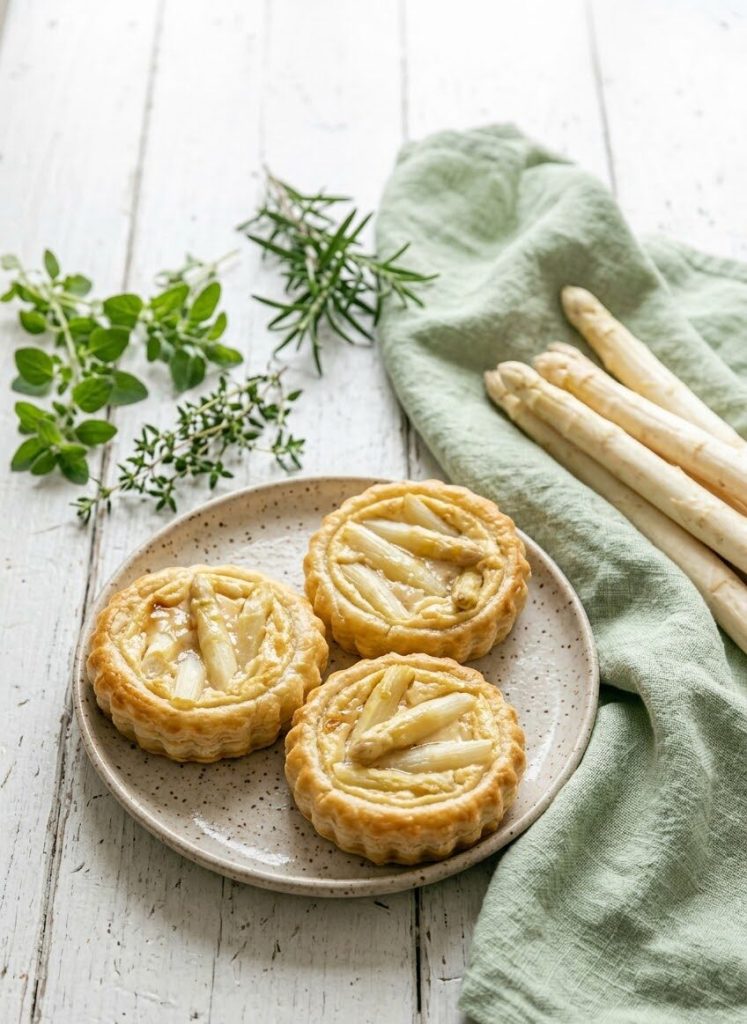 In a food processor, combine the tofu, olive oil, salt, pepper or paprika, nutmeg and herbs such as marjoram or thyme. Blend until you get a thick cream (if necessary, add a tablespoon of the asparagus cooking water). Add the remaining asparagus stems and blend briefly again.Roll out the puff pastry and cut out rounds slightly larger than the molds (about 4–4 3/4 in). Line the molds, prick the bottoms with a fork and fill with the tofu-and-asparagus cream. Decorate the surface with the reserved asparagus tips.