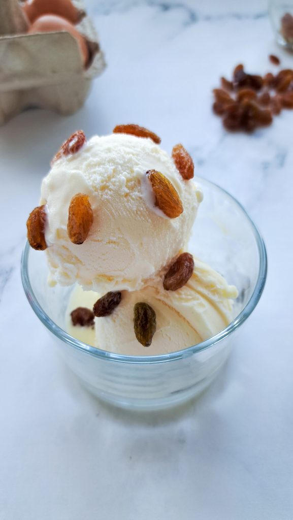 When the ice cream is almost ready, add the raisins. If you don’t have raisins, put some dried grapes in a glass of Moscato for 1 hour.