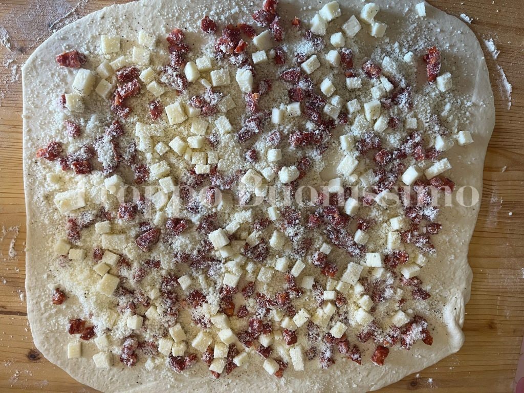 After the rising time, invert the dough onto a floured pastry board, take a piece weighing about 2.5-2.8 oz and set it aside to create the crosses on the eggs. Roll out the rest of the dough with a rolling pin to form a rectangle about 20×16 inches. Distribute the filling ingredients over the entire surface, leaving about 0.4 inches from the edge free.