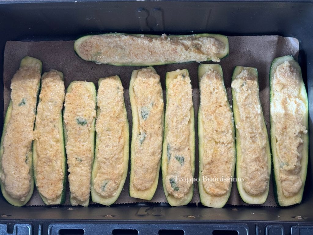 Better to cook without the grill! Place the zucchinis directly in the air fryer basket on perforated parchment paper or a non-stick mat. The grill is not suitable for creamy and delicate preparations like this because the filling might drip.