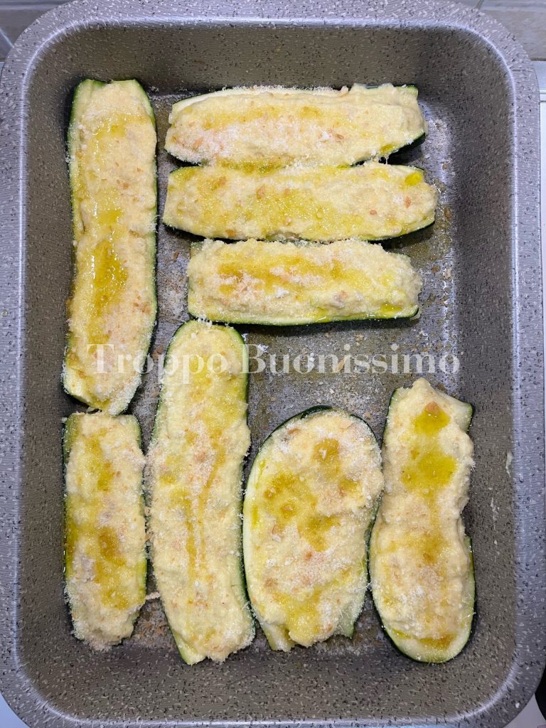 Carefully and patiently, fill the hollowed zucchinis with this delicious filling, distributing the mixture evenly. Transfer the stuffed zucchinis to a previously oiled and breadcrumb-sprinkled baking dish.