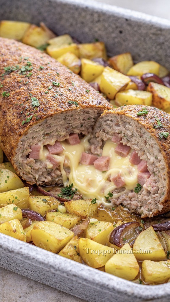 My meatloaf with potatoes and Tropea onions is a tasty and easy-to-make main dish, perfect for a Sunday lunch or a family dinner. This recipe combines the softness of ground meat with the delicately sweet flavor of Tropea onions, enhanced by a side of crispy roasted potatoes.