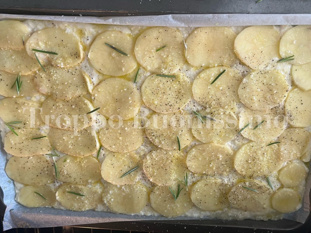 With the help of a mandoline, cut the remaining potatoes into thin slices, cover the surface of the dough with the potato slices, sprinkle with grated cheese, a pinch of salt, rosemary needles, and a drizzle of extra virgin olive oil.
