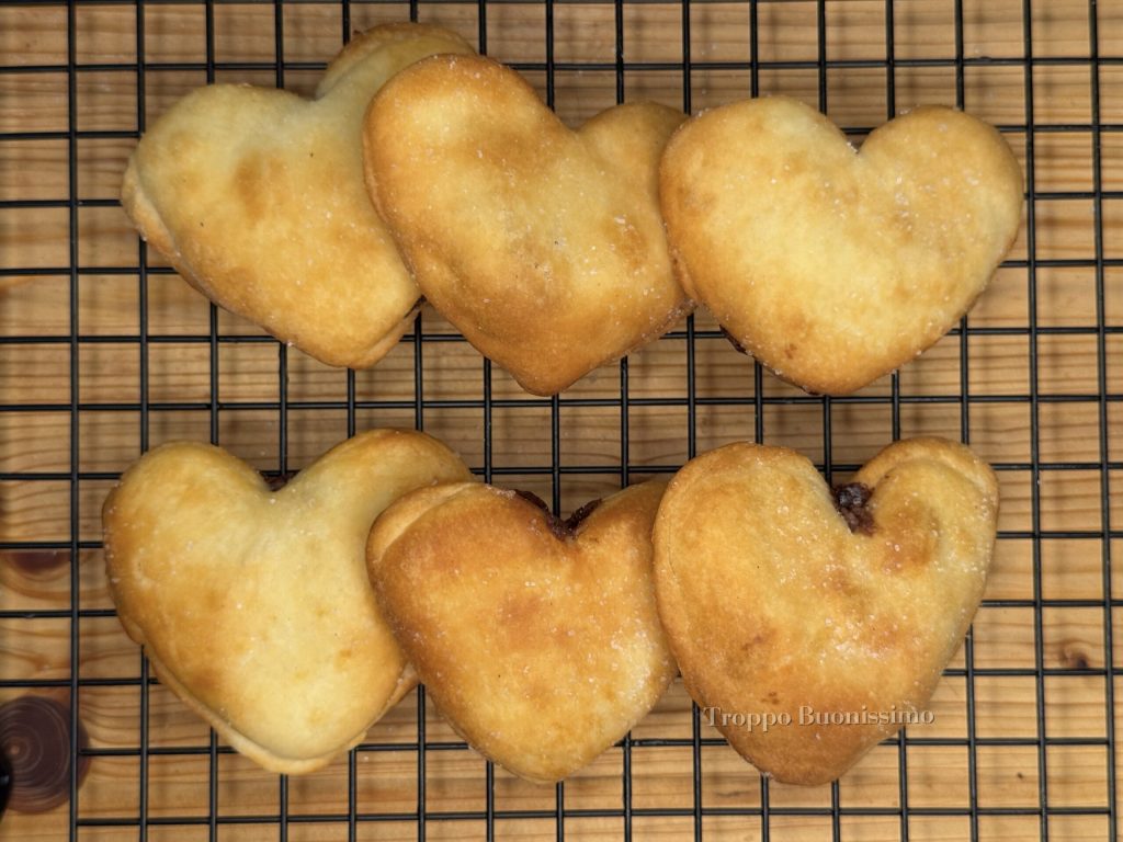 Cover with another heart and seal the edges well by pressing with your fingers or with a fork.Don’t waste the leftover dough: divide it into pieces of 0.7 to 0.9 oz, shape them into balls, flatten them slightly, fill the center with hazelnut cream, and seal the edges well. This way, you’ll have additional donuts, just as soft and delicious!