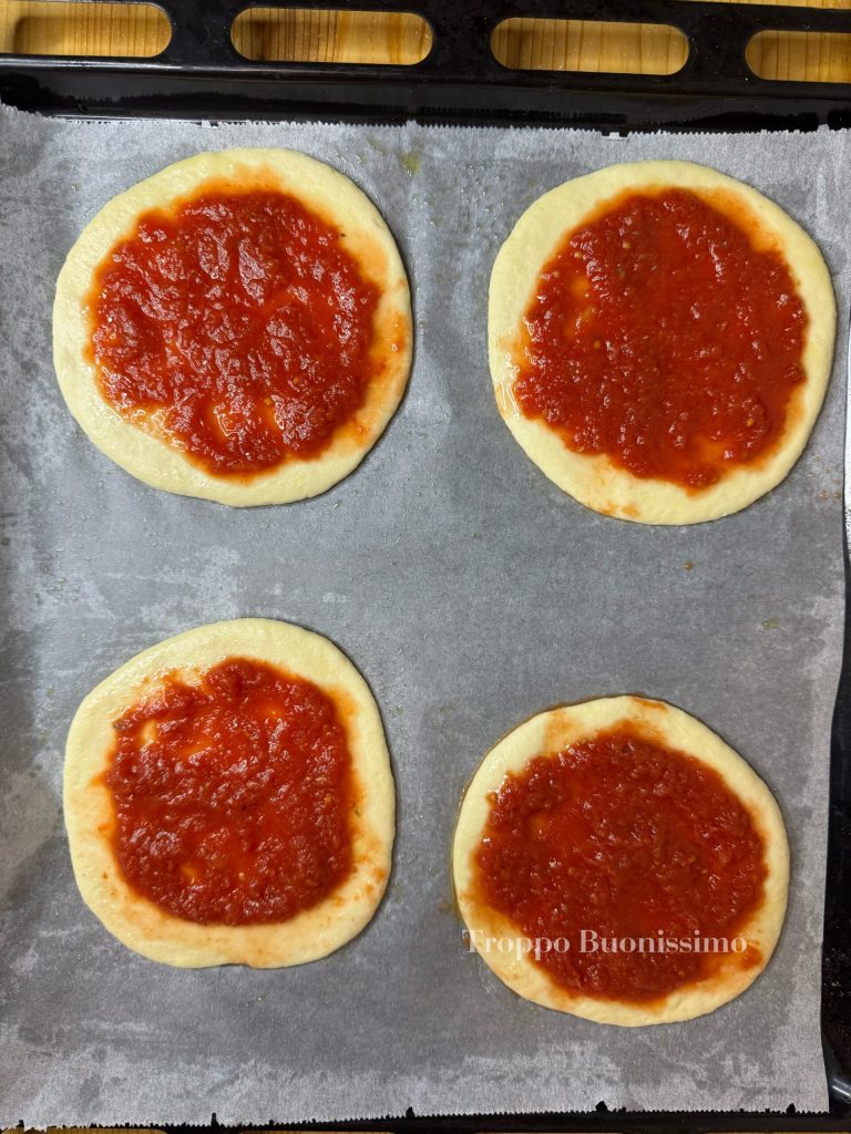 Let rise for another 30 minutes.Season the pizzettes only with tomato, a pinch of salt, and a drizzle of oil.