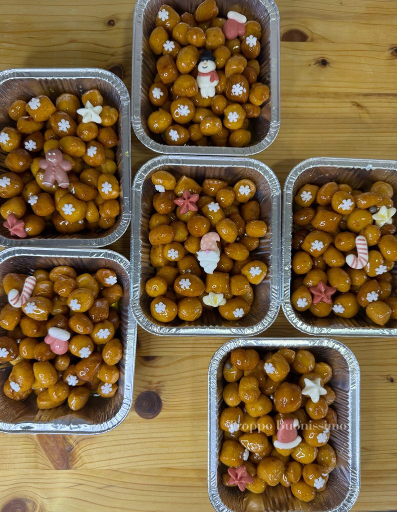 In many Italian regions, struffoli are known by different names: in Abruzzo and Marche, they are called cicerchiata, while in Calabria and Sicily, they are known as pignolata. All these variants tell the richness of Italian traditional Christmas sweets, but the base remains the same: a simple dough that transforms into an explosion of honey, citrus, and color.