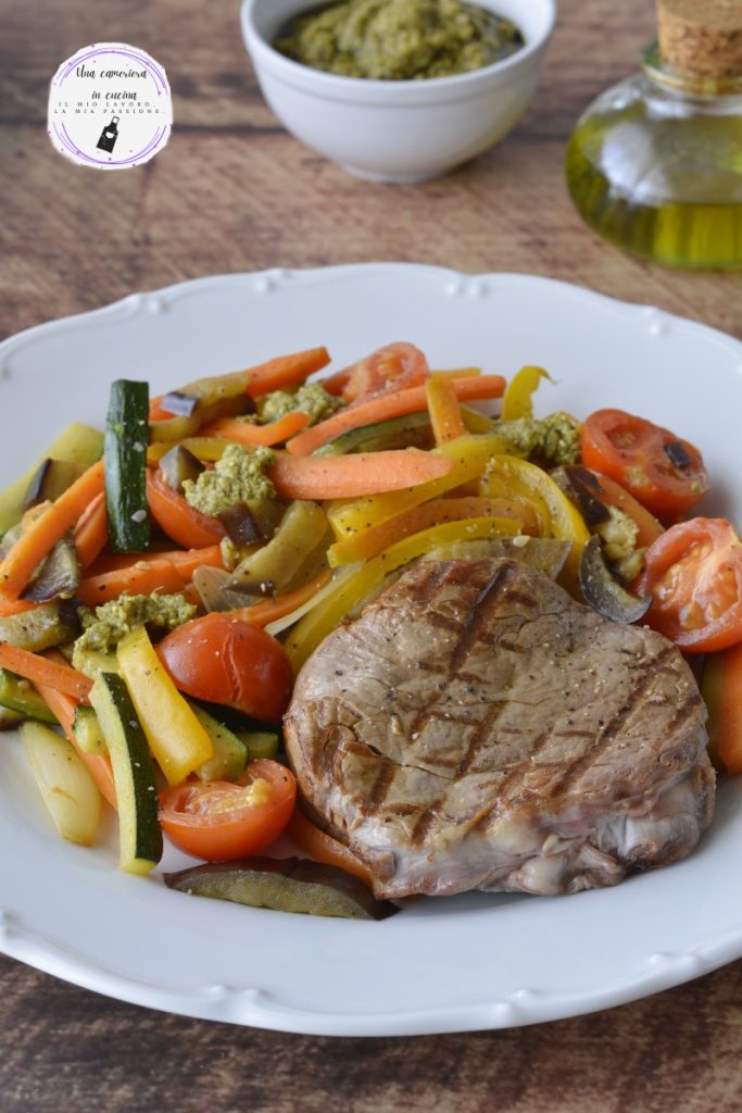 The beef fillet with vegetables and pesto is a tasty and fragrant meat main dish, ideal to serve even on special occasions. Many colorful and delicious vegetables, such as carrots, zucchini, eggplants, and peppers, cooked in a pan and enriched with a few drops of Genovese pesto, accompany the beef.