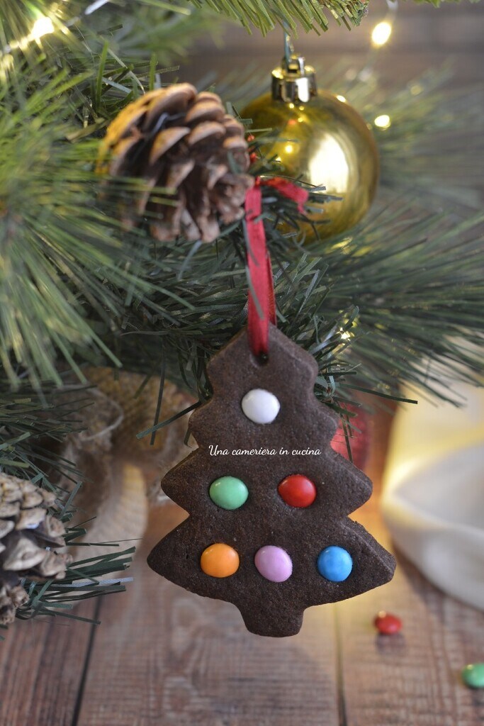 The cocoa tree cookies to hang are delicious and fun, designed to be hung on the Christmas tree or simply given as gifts in an original way. Delicious simple cocoa shortbread cookies, decorated with lots of colorful chocolate sprinkles. They are easy to make and are a great idea to create together with the children.