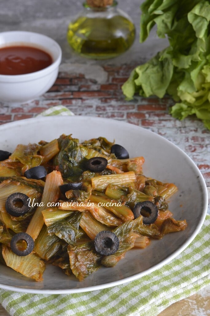 The escarole with tomatoes, olives, and capers is an easy, quick, and flavorful side dish. Ideal to serve with main dishes of meat or fish. For the recipe, just prepare a light sauté with garlic and tomato, then add flavorful black olives and pickled capers. Finally, add the escarole cut into pieces that will cook directly in the sauce. I also find this dish excellent for seasoning short pasta or as a filling for a savory pie.