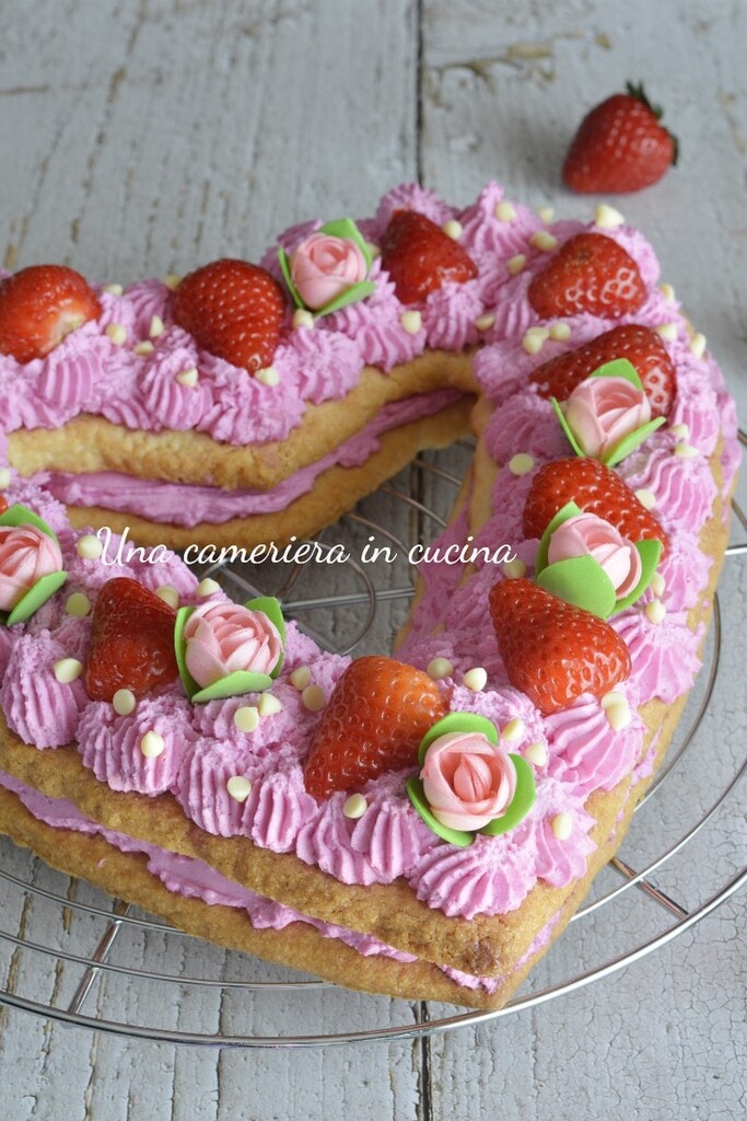 The heart cream tart with camy cream and strawberries is a delightful cake designed especially for Mother’s Day. Two heart-shaped shortcrust pastry layers filled with camy cream, an uncooked cream made of cream and mascarpone, to which I added vegetable food coloring to give a touch of color, in this case pink, filled with seasonal strawberries, white chocolate chips, and edible wafer roses for decoration that you can modify as you like.
