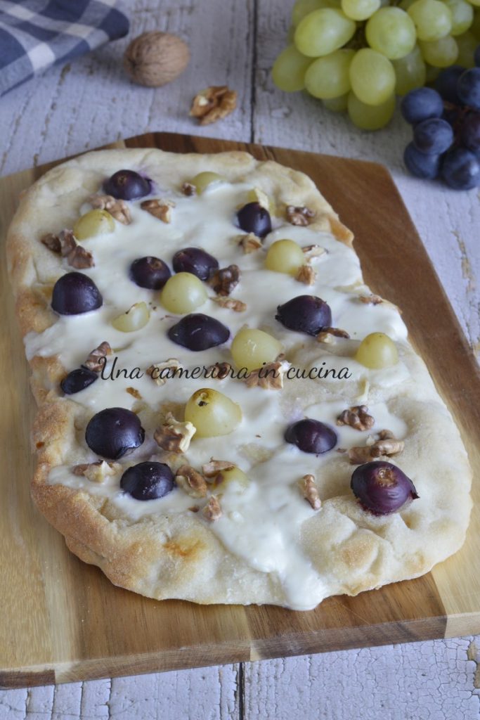 • Top the pinsa with crescenza cheese and grapes, both white and black, washed and either left whole or halved.