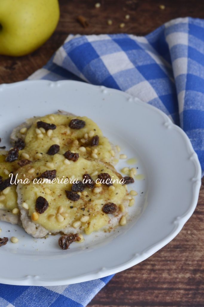 Serve the pork loin slices topped with the warmed apple puree, add the remaining squeezed raisins, the pine nuts, a sprinkle of cinnamon, and pepper to taste. Serve hot.
