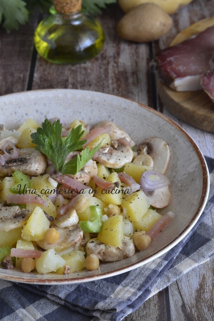 The potato, mushroom, chickpea, and speck salad is an easy, quick, and tasty dish. Based on boiled potatoes, then raw sliced champignon mushrooms, milder shallots compared to onion, pre-boiled chickpeas, celery for crunchiness, and speck that gives a smoky flavor to the dish. It can be served as an appetizer, main course, or rich side dish.